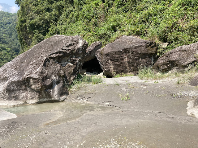 摩里沙卡洞穴溫泉,位於花蓮溪上游的萬里溪。因台電開發西寶水庫時在山洞內湧出,工人於是砌了個小 湯池,成就了今天的秘境。今天我便要前往探索這溫泉秘境,享受那天然療癒的野溪溫泉。往林田山方向,在消防隊大樓前的這個耕心園標示牌左轉。看到西寶大橋就左轉防汛道路,不要過橋。看到堤防邊的這顆大石頭就可以路邊停車了。雖然有些人會過橋停在對岸,可以減少一次渡河,少走10分鐘。不過那裏停車空間有限,不像這裡防汛道路,停車非常方便。10:25正式開走。跨過堤防,走上這個取水道的沙堤。一路往前走到底。左邊的取水引道,水質非常乾淨,簡直就是一個天然的游泳池。下了沙堤後,這裡是第一次跨越河道。如果可以,帶根登山杖。除了可以作為支撐外,過溪時也可先探探河道的狀況,增加安全性。過河後可以往右邊靠,轉進吉普車隊輾壓過出的道路上,這樣比較好走。根據事先網路上所做的功課,基本上就是順著道路走,接著就會來到第二次渡河的地方。然後會進入到一段類似產業道路,這裡路況佳,又有芒草灌木可以遮蔭,走起來相當舒服。出了產業道路後,看到岸邊岩石上的這棵大樹,就無法繼續靠左岸前進。所以必須進行第三次的跨河。這裡水深到大腿,只要踩穩重心,小心前進,應可順利通過。台灣得天獨厚,山地面積約佔總面積的70%,有各種大小的溪流穿越其中,這是老天的恩澤,身在福中要知福,有興、有閒、有能更要往這些大小山或溪流去走走、看看,你將會讚嘆、感恩老天對台灣的賞賜!約11點來到了這個巨石區,前方總算有看到一批的溯溪客,這是商業團的隊。由於巨石邊的河水滿深的,我決定不涉水。而巨石中間的洞穴也不寬,我也不想鑽的衣服髒兮兮。所以就以攀爬方式,從巨石上方爬過去。沿著溪邊的亂石區跳上跳下,在這樣的藍天、綠水、青山、好空氣的美好環境下,戶外踏青攬勝的感覺真好!11:10看到這根黑底白身的鐵軌橋墩,就知道目的地到了。原來此段森林鐵路是始建於日據時代的林田山鐵路,全長近60公里,曾造就萬榮村一片輝煌榮景。我的腦中依稀浮現當時火車緩慢經過的優雅身影!秘境的溫泉池就藏身在橋墩對面的那片黃色山腰中,溫泉池溢出的溫泉,日積月累,形成黃色的堆積岩壁。有不少青年男女在河邊戲水釣魚。想一睹洞穴溫泉美麗容顏,得費上一番功夫,順著這片黃色的岩壁攀爬而上喔!還好岩壁不會太滑,雖然有些陡峭,不過有好心的山友架了繩索可拉,對於習慣攀登山岳的我而言,蛋糕一塊啊。也提醒看官,下來的時候,要以倒退的方式下來才比較安全喔!哇!終於見到傳說中的摩里沙卡洞穴溫泉!她猶如絕世美女,養在深閨人未識啊!脫了上衣,馬上投入她的懷抱,哈哈!約40度的溫泉水,大概2坪大的泡湯池,簡直就是我的私人專屬湯屋,要不是今天天氣熱,否則泡起來更舒服!站在洞穴溫泉外,俯瞰清澈透藍的溪水,日以繼夜的切割巨石,形成峽谷的地形,好山好水好花蓮,台灣真是幸福寶島啊!坐在激流中石塊上,我想這該是花蓮CP值最高的野溪溫泉了!距離約3公里,不用一小時即可抵達,實在太親民了!